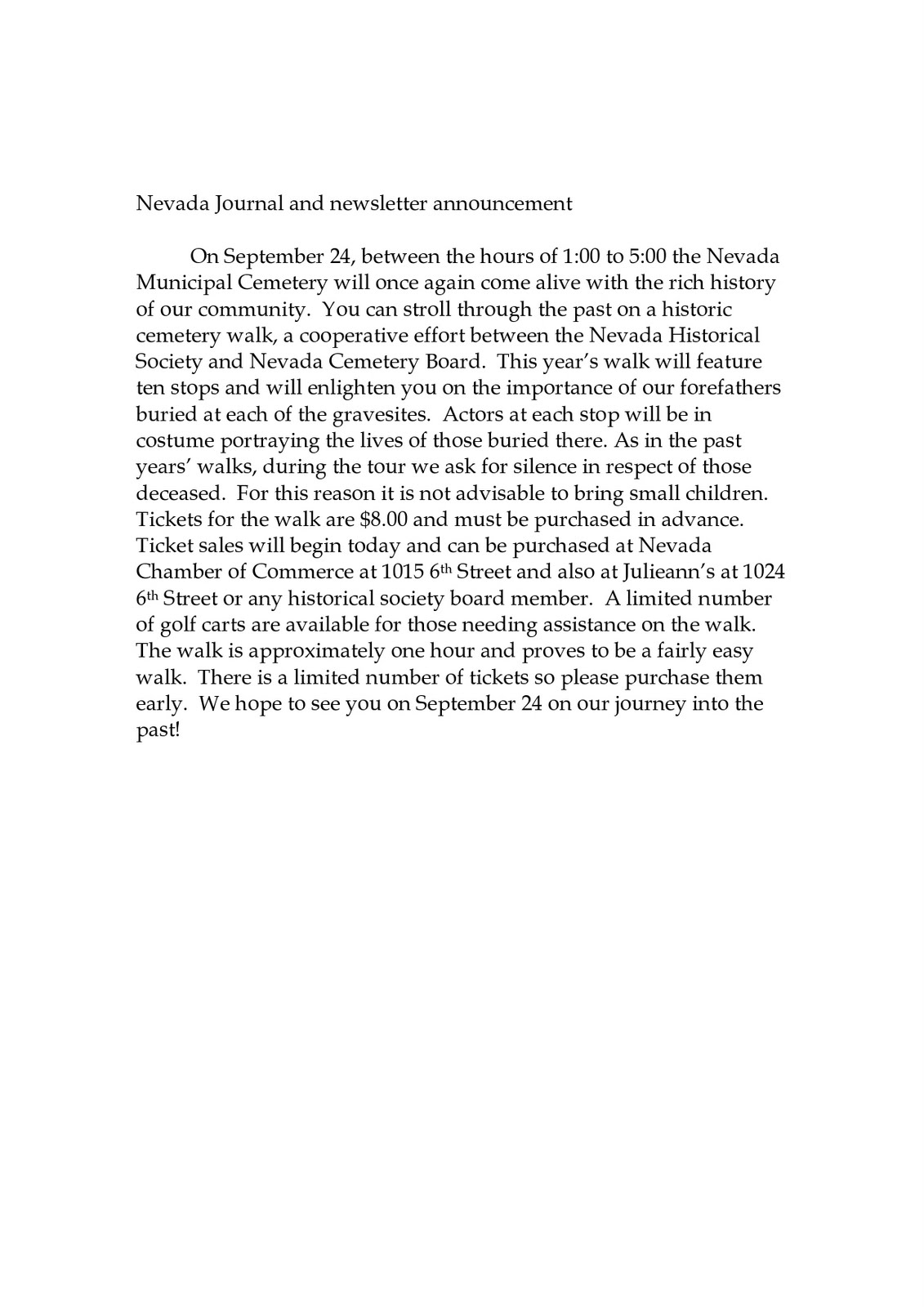 The Nevada Historical Society will have a Historic Cemetery Walk at the Nevada Municipal Cemetery on Saturday, September 24, 2011. Tickets ($8) should be purchased in advance as the number is limited. See the files on the left for additional details (click on them and click it a second time for a larger version) or contact Kris at 382-4854 for additional details.
